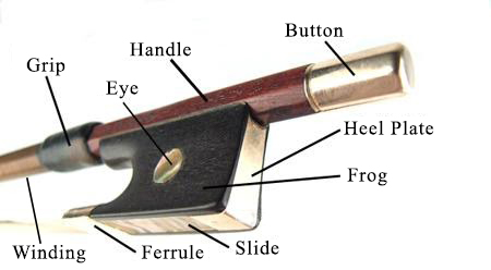 All references of orientation are standardized as follows: The front of the bow is where the head is located, the back is where the frog is located. A bow held upright will have the stick at the top and the frog and hair at the bottom. The left and right sides of the bow are also referred to as thumb and finger sides respectively.
